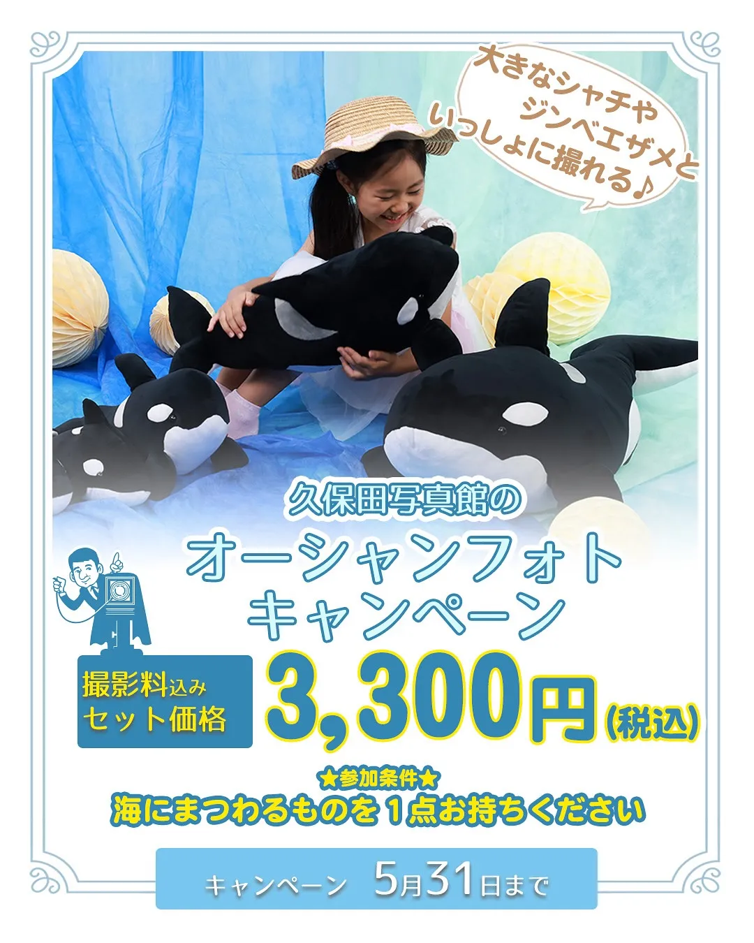 久保田写真館のオーシャンフォトキャンペーン🏝️⁡⁡久保田写真館では今年も海にまつわるお得なキャンペーンを開催🐠⁡⁡⁡★参加費3,300円(税込)⁡★参加商品・キャビネサイズお写真1枚・写真と同じ画像をSNS用…