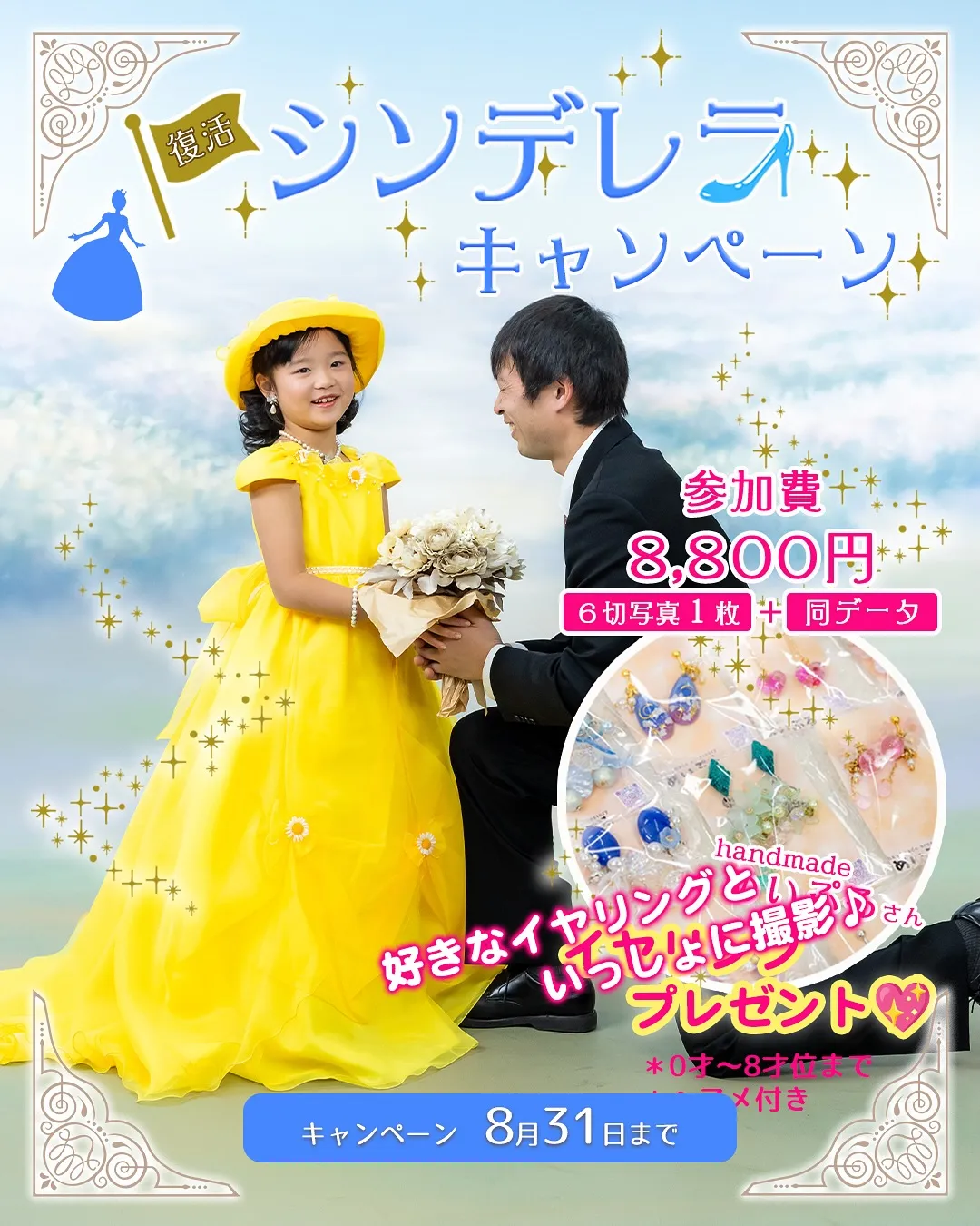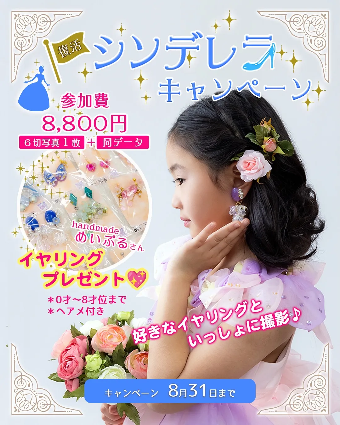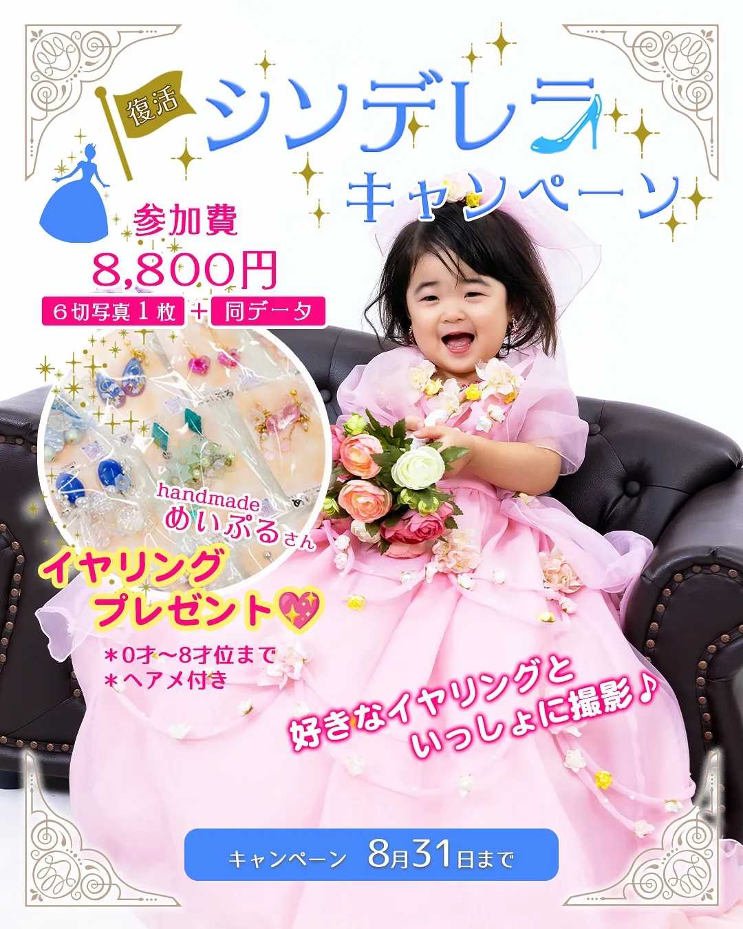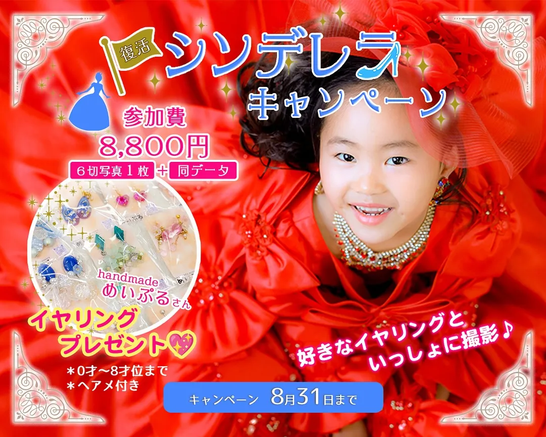 この秋七五三を迎えるお嬢様にもおすすめシンデレラキャンペーン✨⁡⁡★参加費お一人様8,800円(税込)✨✨★参加商品・6切りサイズお写真1枚(好きなショットを選べます📷)⁡・写真と同じロゴ入り画像をSNS用デ…